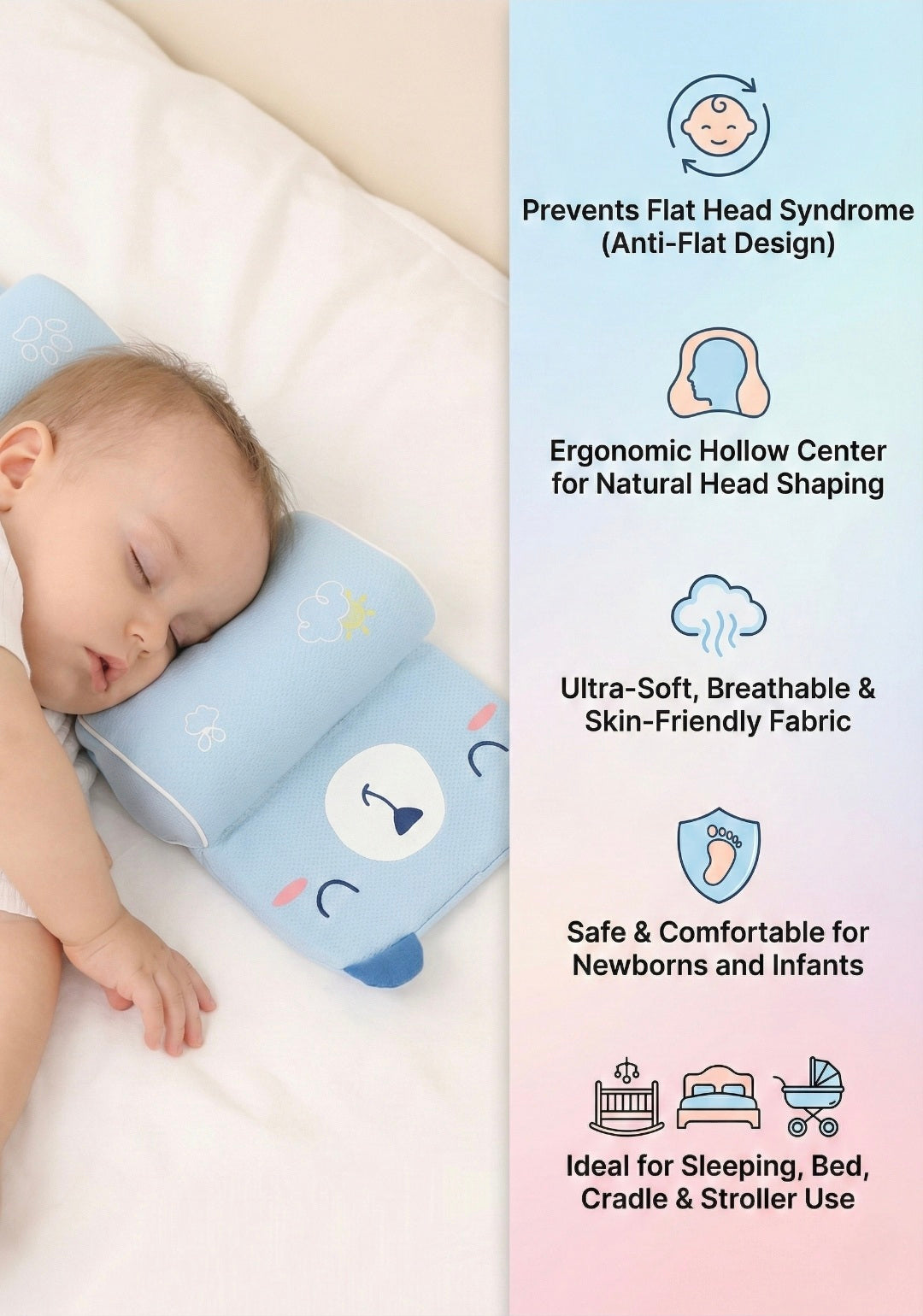 Pehle baby sote time baar-baar head ghumata tha, mujhe tension rehti thi. Is pillow ke baad baby zyada peacefully sota hai. Head ko proper support milta hai aur mujhe bhi thoda relief mil gaya. New parents ke liye bohot helpful product hai.