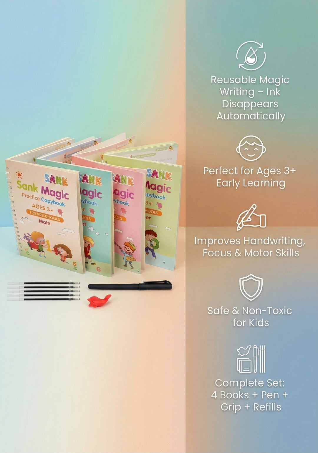 My child enjoys practicing with this magic copybook. Letters disappear and kids can practice again. Very helpful for handwriting improvement.”